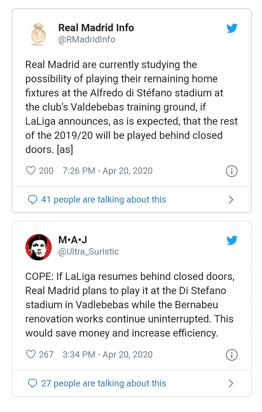 With the conclusion of the UEFA meeting that most of the league across the Europe will be played behind closed doors once football returns, which is expected to ends before August 29. Real Madrid board members see it as a perfect opportunity to go ahead for the expansion throughout September.